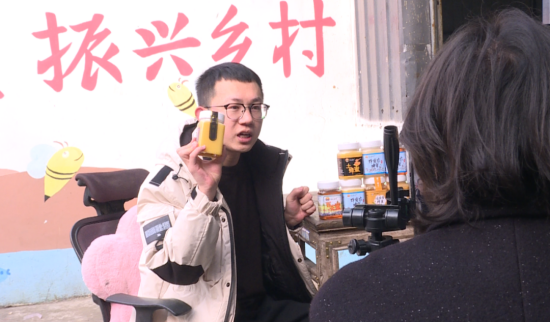 来到位于白马镇流村村的四川省蜂运堂蜂业有限责任公司,首先映入眼帘的就是墙上的“发展产业、振兴乡村”几个大字。带货主播李阳正在公司门口进行直播卖货。“今天给大家主要推荐的是一款我们四川的特产,也是我们乐山当地的一张名片——五倍子的土蜂蜜……”