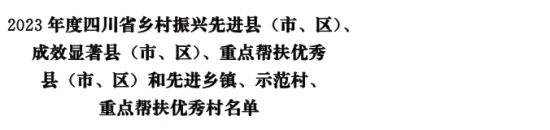 为激励先进、鼓舞干劲,根据2023年度县(市、区)实施乡村振兴战略分类考评结果,省委、省政府决定,命名大邑县等10个县(市、区)为“2023年度四川省乡村振兴先进县(市、区)”,成都市温江区等15个县(市、区)为“2023年度四川省乡村振兴成效显著县(市、区)”,乐山市金口河区等10个县(市、区)为“2023年度四川省乡村振兴重点帮扶优秀县(市、区)”,成都市温江区寿安镇等50个乡镇为“2023年度四川省乡村振兴先进乡镇”,成都市龙泉驿区同安街道红旗村等500个村为“2023年度四川省乡村振兴示范村”,简阳市平泉街道梓桐村等200个村为“2023年度四川省乡村振兴重点帮扶优秀村”。