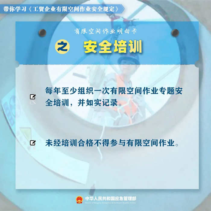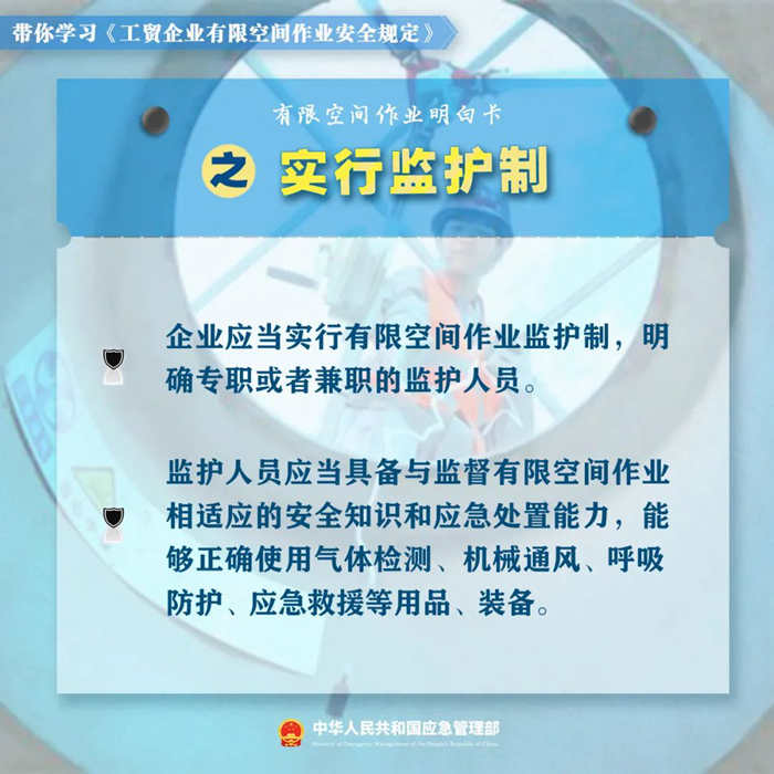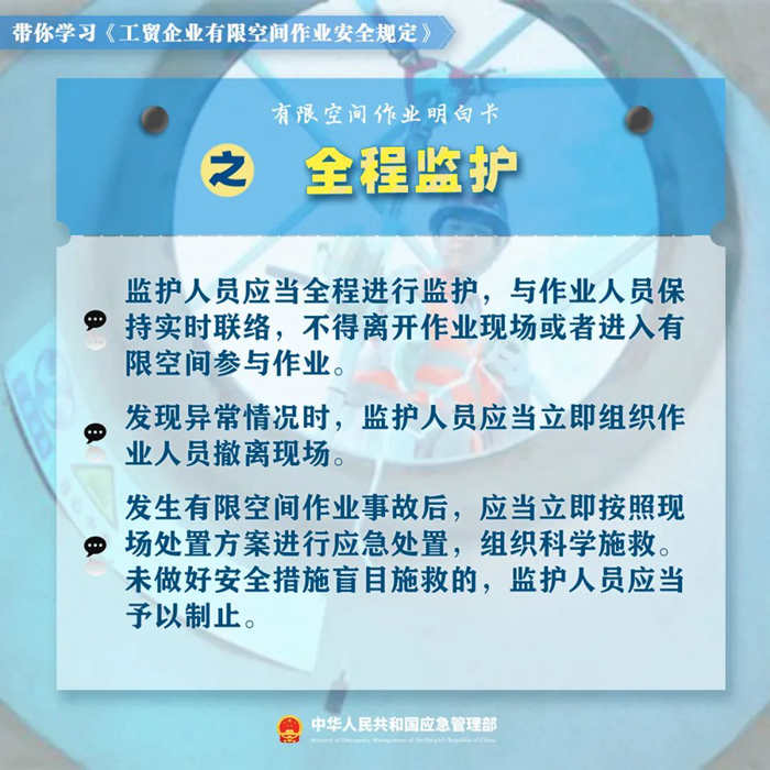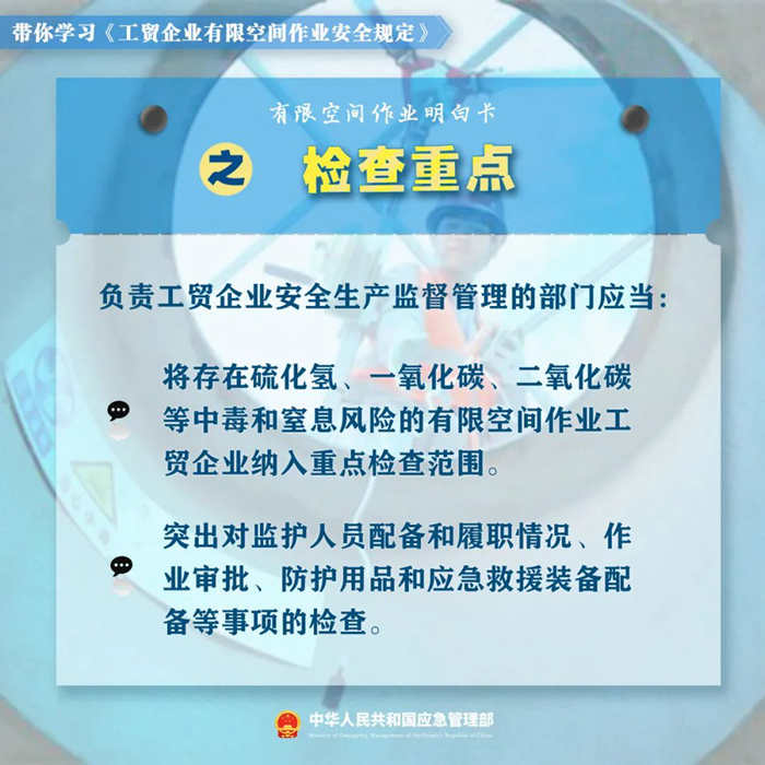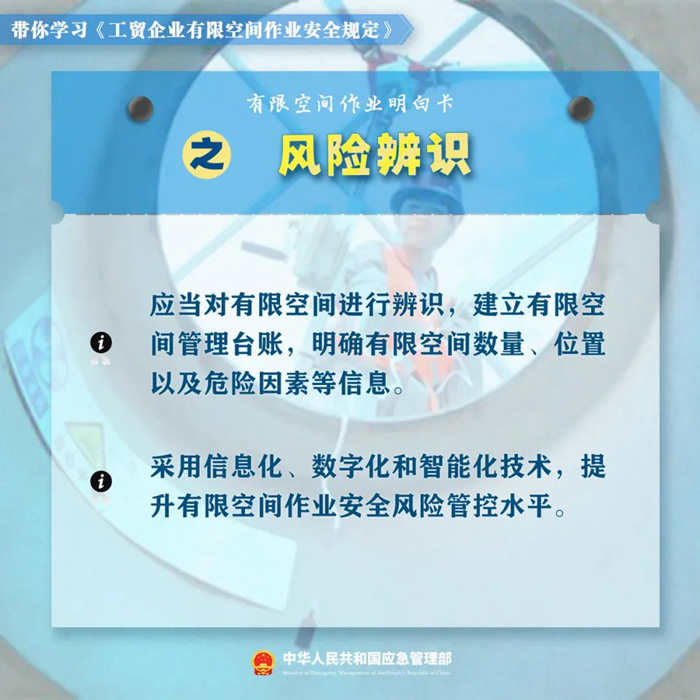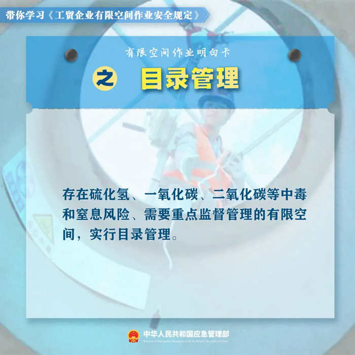 新修订的《工贸企业有限空间作业安全规定》。对作业审批、发包管理、应急演练等关键环节的管理有哪些要求?企业和监管部门如何落实《规定》?这份有限空间作业明白卡,带你一起学习新规!