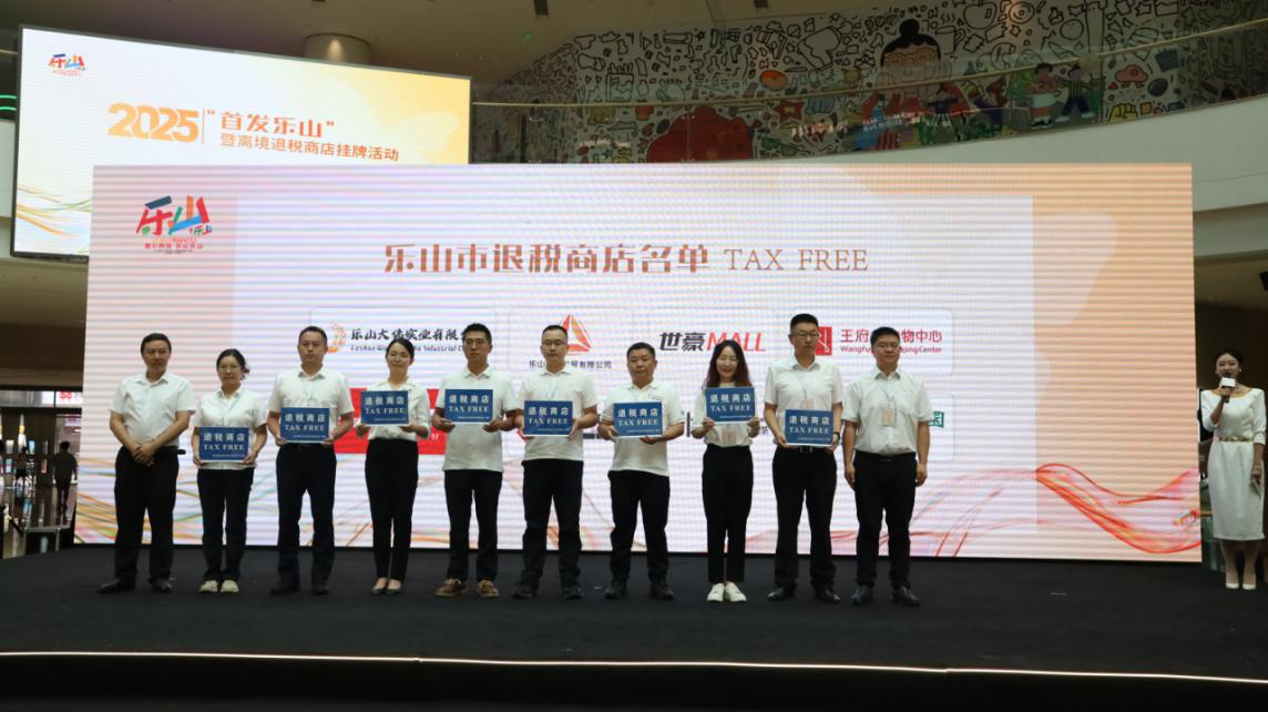 8月22日上午,由四川省商务厅、国家税务总局四川省税务局指导、乐山市商务局、国家税务总局乐山市税务局主办的2025“首发乐山”暨离境退税商店挂牌活动在世豪广场举行。