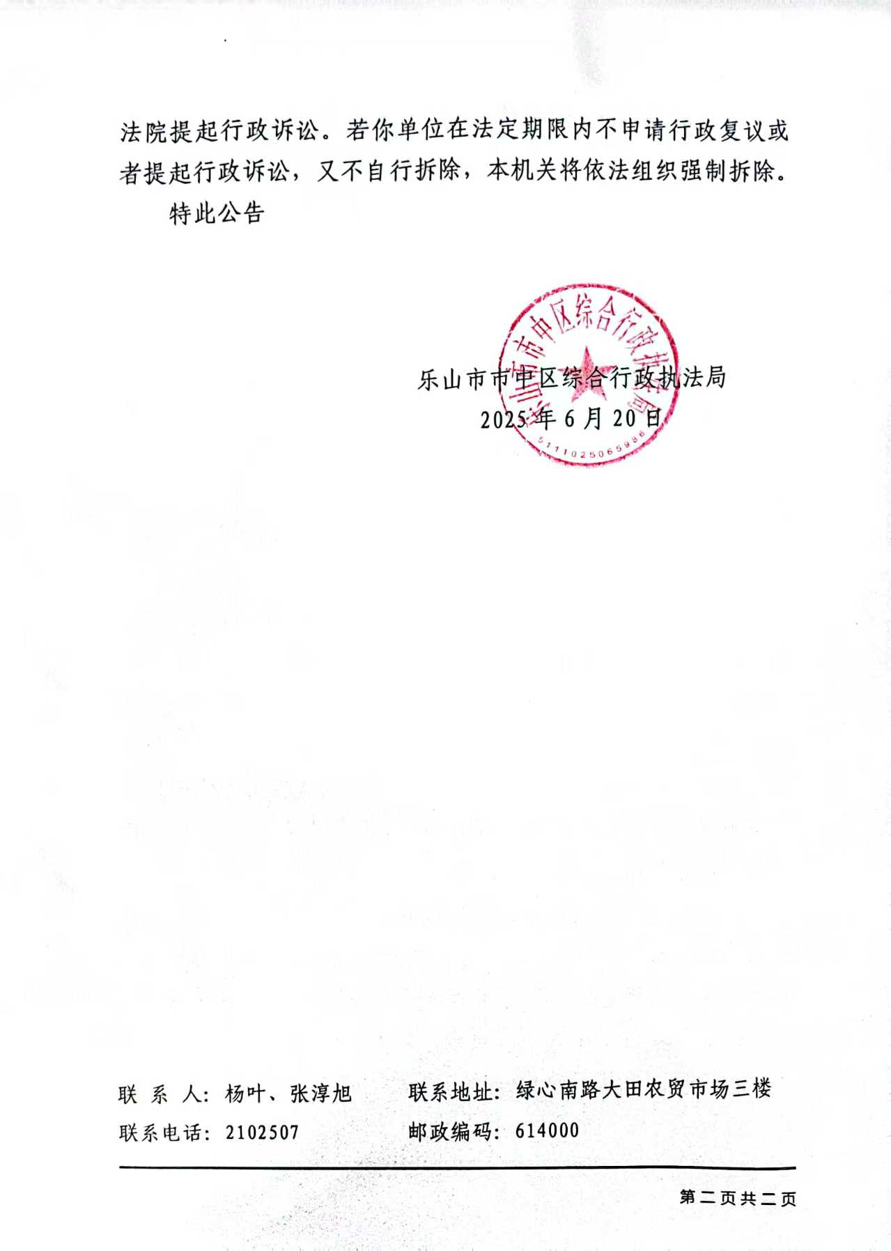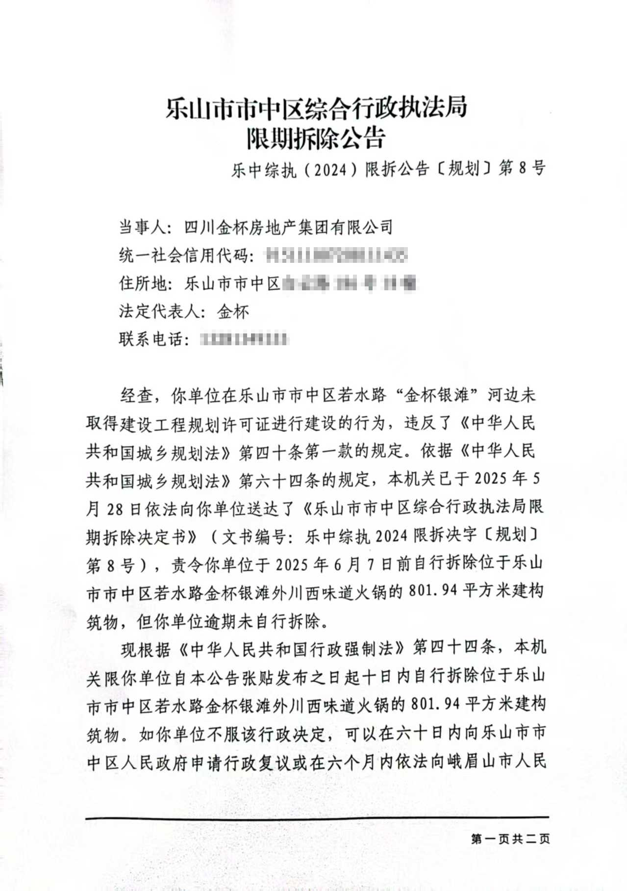 现根据《中华人民共和国行政强制法》第四十四条,本机关限你单位自本公告张贴发布之日起十日内自行拆除位于乐山市市中区若水路金杯银滩外川西味道火锅的801.94平方米建构筑物。如你单位不服该行政决定,可以在六十日内向乐山市市中区人民政府申请行政复议或在六个月内依法向峨眉山市人民法院提起行政诉讼。若你单位在法定期限内不申请行政复议或者提起行政诉讼,又不自行拆除,本机关将依法组织强制拆除。