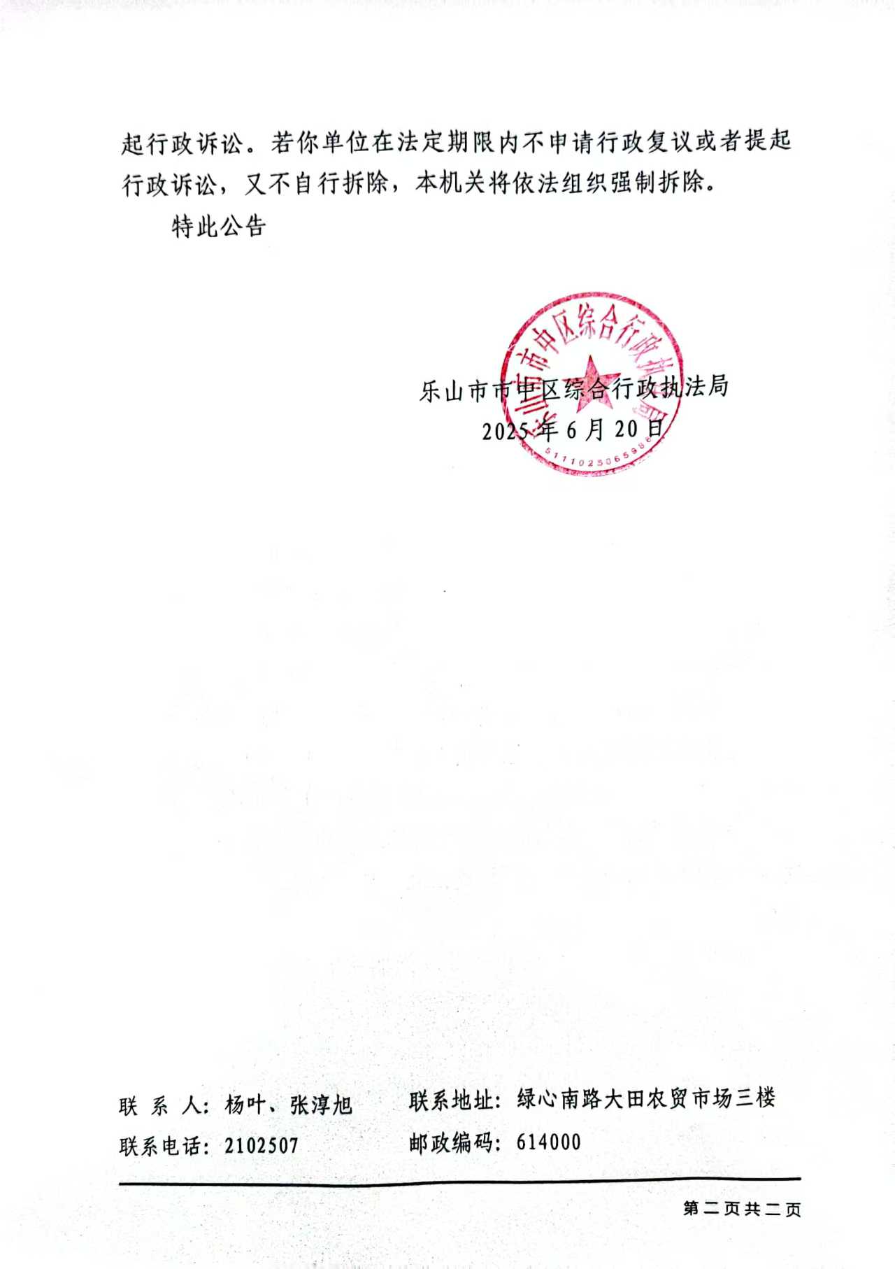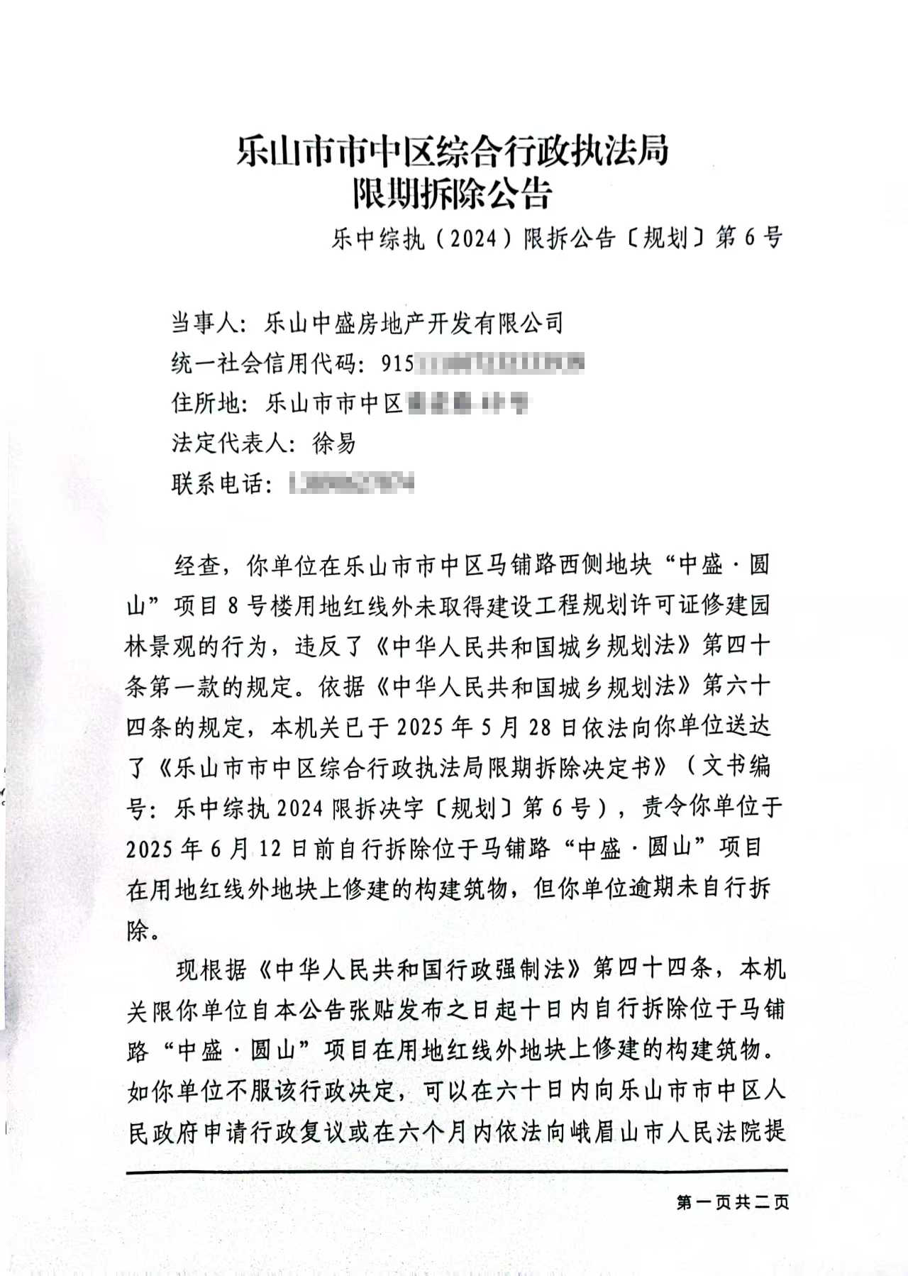 现根据《中华人民共和国行政强制法》第四十四条,本机关限你单位自本公告张贴发布之日起十日内自行拆除位于马铺路“中盛·圆山”项目在用地红线外地块上修建的构建筑物。如你单位不服该行政决定,可以在六十日内向乐山市市中区人民政府申请行政复议或在六个月内依法向峨眉山市人民法院提起行政诉讼。若你单位在法定期限内不申请行政复议或者提起行政诉讼,又不自行拆除,本机关将依法组织强制拆除。