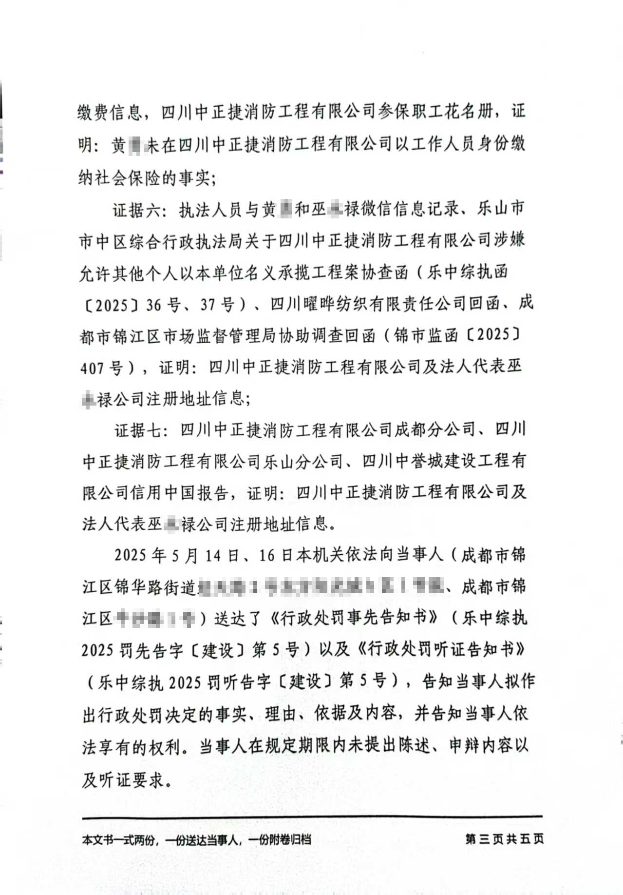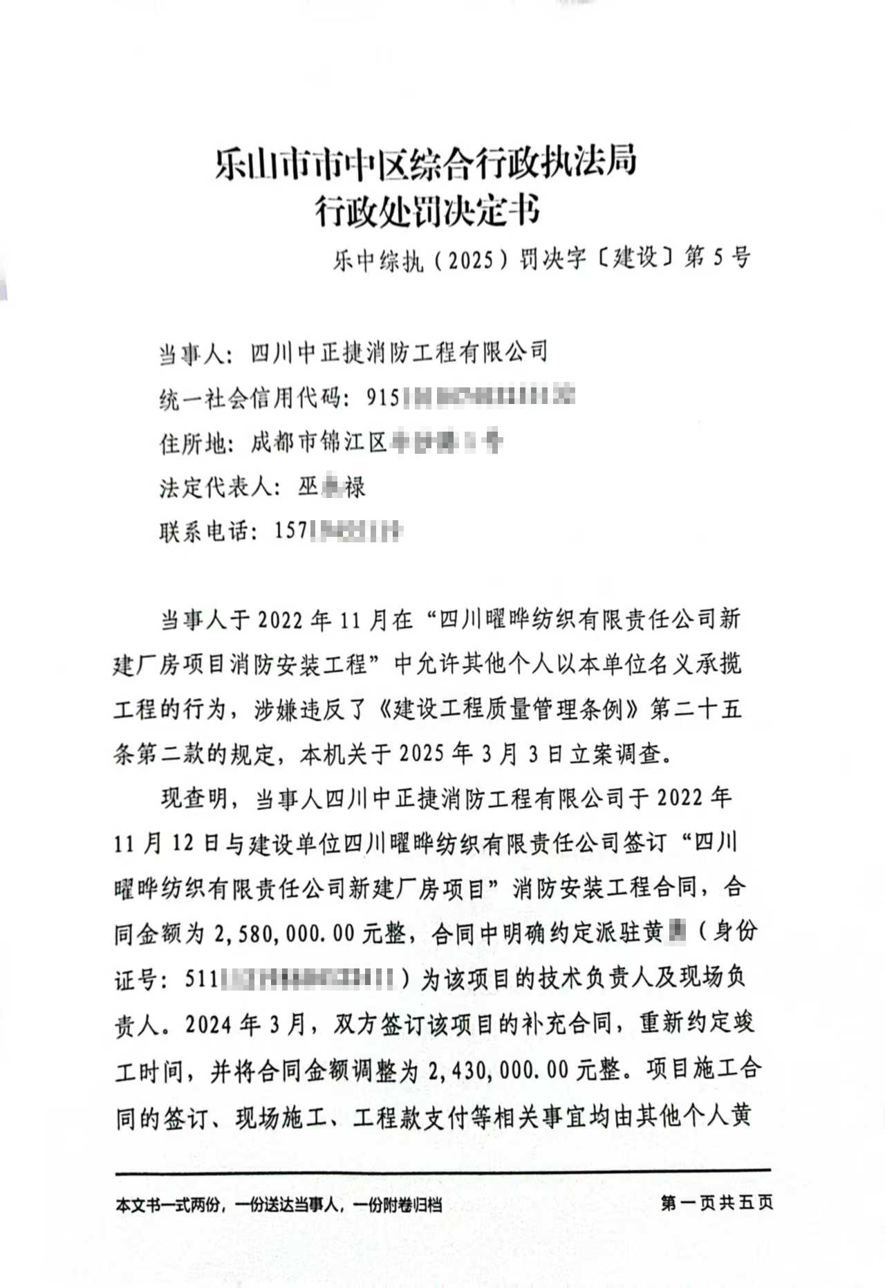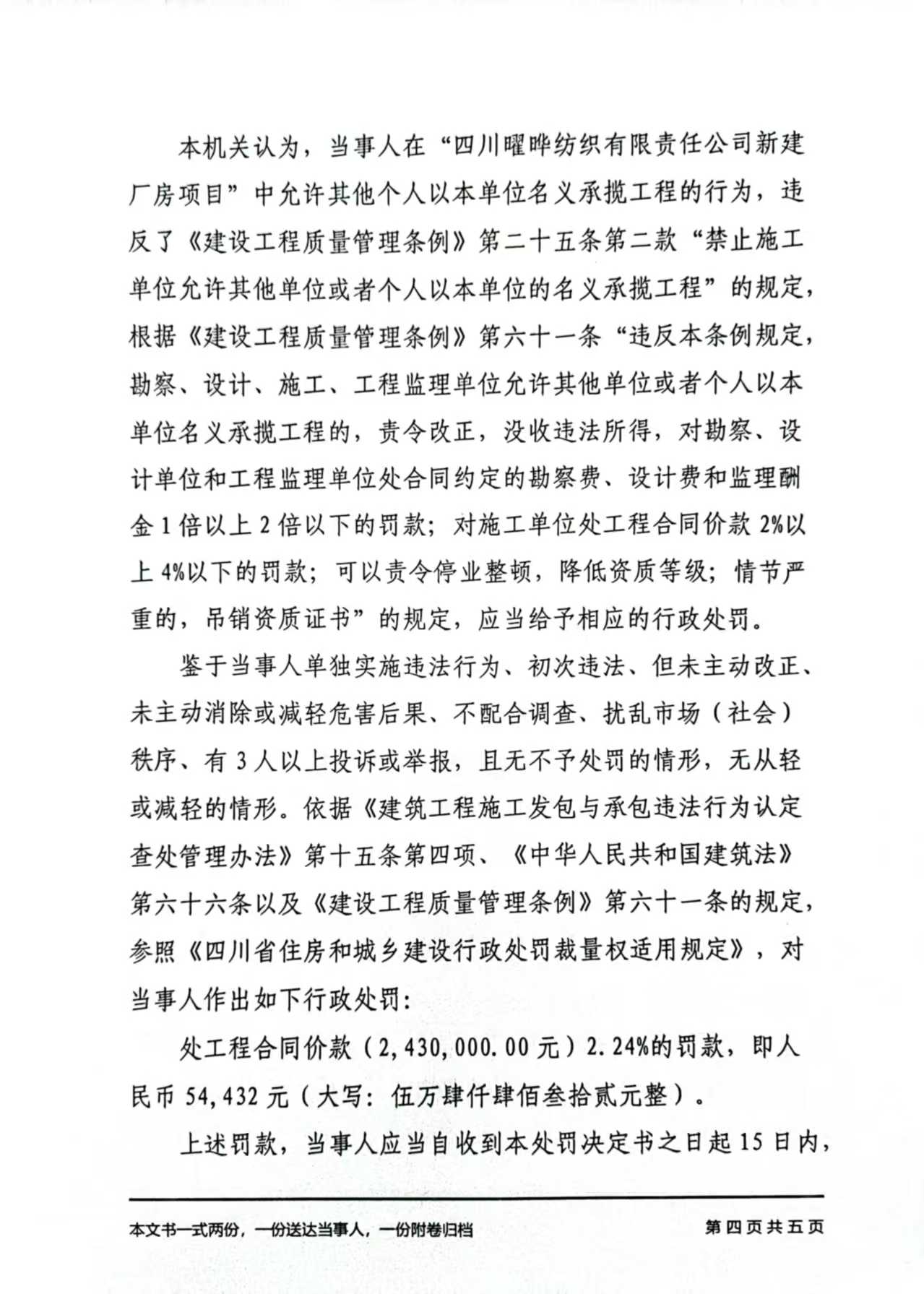 你单位的上述行为违反了《建设工程质量管理条例》第二十五条第二款“……禁止施工单位允许其他单位或者个人以本单位的名义承揽工程”的规定,依据《建设工程质量管理条例》第六十一条“违反本条例规定,勘察、设计、施工、工程监理单位允许其他单位或者个人以本单位名义承揽工程的,责令改正,没收违法所得……对施工单位处工程合同价款百分之二以上百分之四以下的罚款;可以责令停业整顿,降低资质等级;情节严重的,吊销资质证书。”的规定,本机关于2025年5月28日对你单位作出罚款人民币54,432元(大写:伍万肆仟肆佰叁拾贰元整)的行政处罚(决定书文号:乐中综执2025罚决字〔建设〕第5号)。因其他法定方式无法送达,现依法向你单位公告送达《行政处罚决定书》,自公告之日起经过30日,即视为送达。你单位可在收到《行政处罚决定书》之日起15日内联系本机关(联系电话:0833-2101855)缴纳罚款。