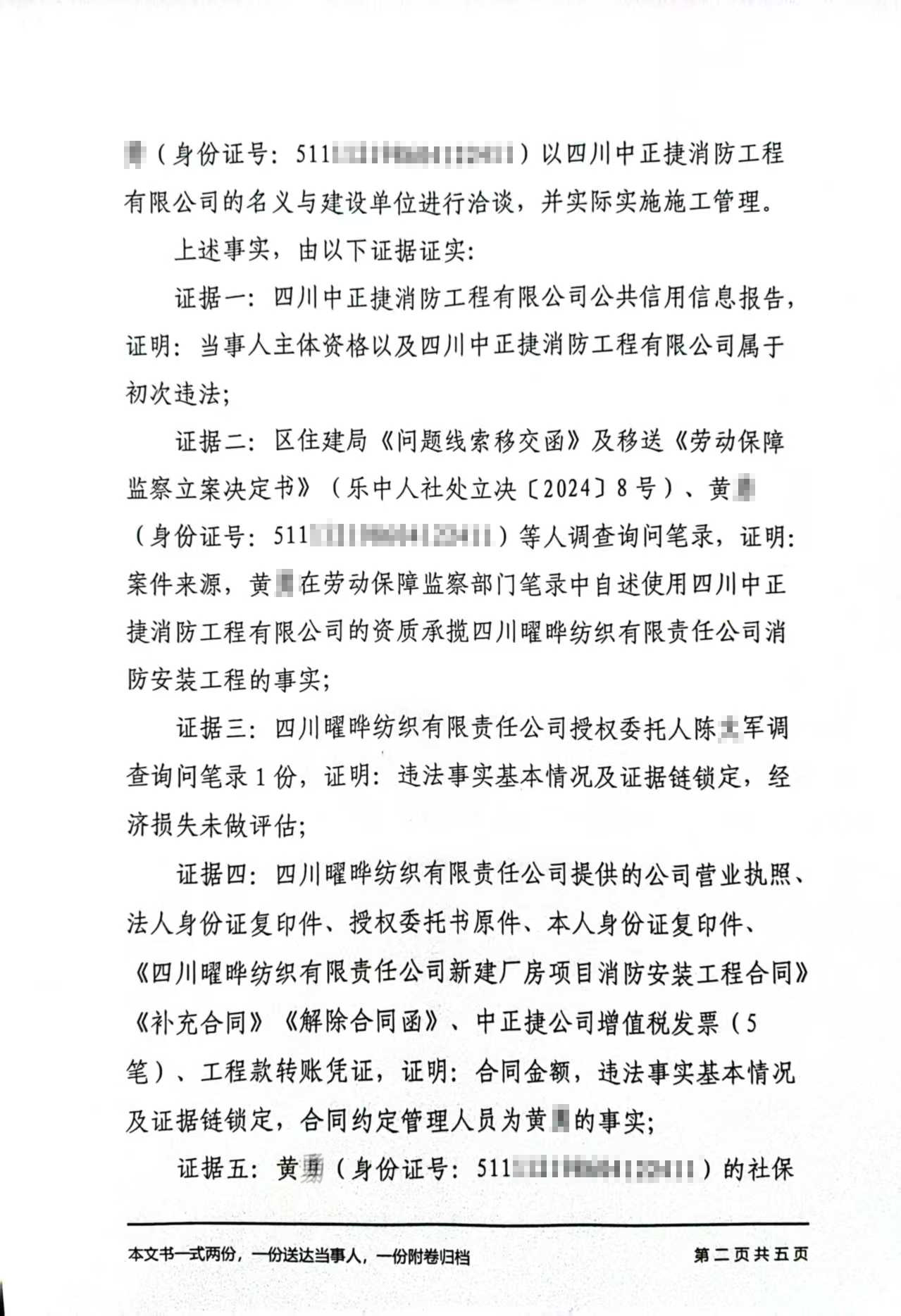 你单位于2022年11月承揽“四川曜晔纺织有限责任公司新建厂房项目消防安装工程”,在施工过程中由其他个人黄*(身份证号:51111219860412****)以你单位的名义实施管理(包含施工合同签订、项目现场施工、工程款支付等具体工作)。你单位的上述行为属于《建筑工程施工发包与承包违法行为认定查处管理办法》第八条第一款第(三)项“存在下列情形之一的,应当认定为转包,但有证据证明属于挂靠或者其他违法行为的除外:(三)施工总承包单位或专业承包单位未派驻项目负责人、技术负责人、质量管理负责人、安全管理负责人等主要管理人员,或派驻的项目负责人、技术负责人、质量管理负责人、安全管理负责人中一人及以上与施工单位没有订立劳动合同且没有建立劳动工资和社会养老保险关系,或派驻的项目负责人未对该工程的施工活动进行组织管理,又不能进行合理解释并提供相应证明的;”认定情形。