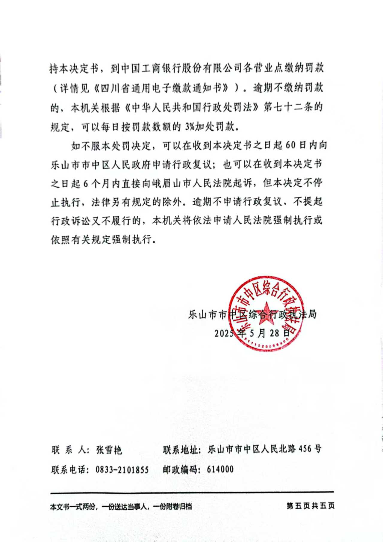 附件:《乐山市市中区综合行政执法局行政处罚决定书》