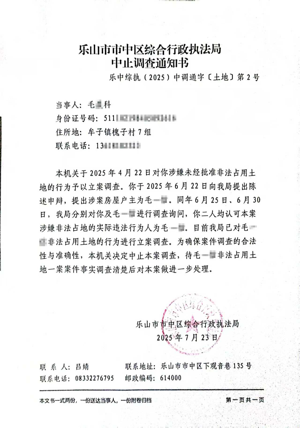 本机关于2025年4月22日对你涉嫌未经批准非法占用土地的行为予以立案调查。你于2025年6月22日向我局提出陈述申辩,提出涉案房屋户主为毛**。同年6月25日、6月30日,我局分别对你及毛**进行调查询问,你二人均认可本案涉嫌非法占地的实际违法行为人为毛**。目前我局已对毛**非法占用土地的行为进行立案调查。为确保案件调查的合法性与准确性,本机关决定中止本案调查,待毛**非法占用土地一案案件事实调查清楚后对本案做进一步处理。