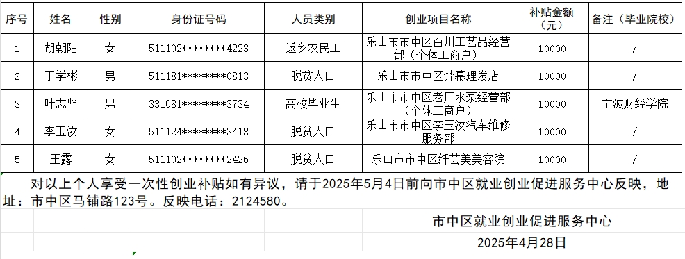 乐山市市中区2025年创业补贴公示(第2批)
