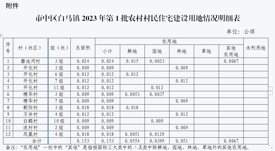 二、同意将你镇磨池河村3组,开化村3、6、7、11组,精华村3、7组,朝阳村3组,万井村4组,白鹤村10组,流村村2组,凤凰村4组,共计0.153公顷集体农用地(其中:非永久基本农田耕地0.0554公顷,园地0.0399公顷,林地0.051公顷,其他农用地0.0067公顷)转为集体建设用地,作为市中区白马镇2023年第1批农村村民住宅建设用地。
