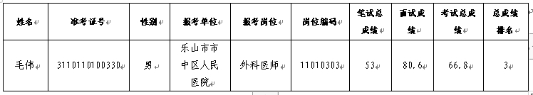 根据中共乐山市市中区委组织部、乐山市市中区人力资源和社会保障局《关于2024年乐山市市中区事业单位公开考试招聘工作人员的公告》规定,通过笔试、面试、体检、综合考察等程序,确定毛伟为拟聘用人员,现予以公示。