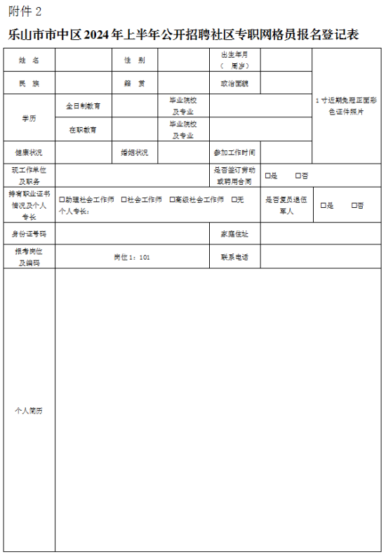 2.乐山市市中区2024年上半年公开招聘社区专职网格员报名登记表