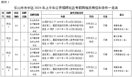 1.乐山市市中区2024年上半年公开招聘社区专职网格员岗位和条件一览表
