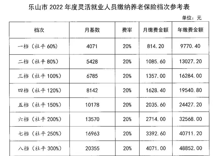 2021年全省城镇全部单位就业人员平均工资(以下简称“全口径工资”)为81420元。2022年度,全省职工基本养老保险缴费基数上限为上年全口径工资的300%,即20355元/月;下限为上年全口径工资的60%,即4071元/月。乐山市灵活就业人员可在上下限范围内八个档次中自主选择缴费。