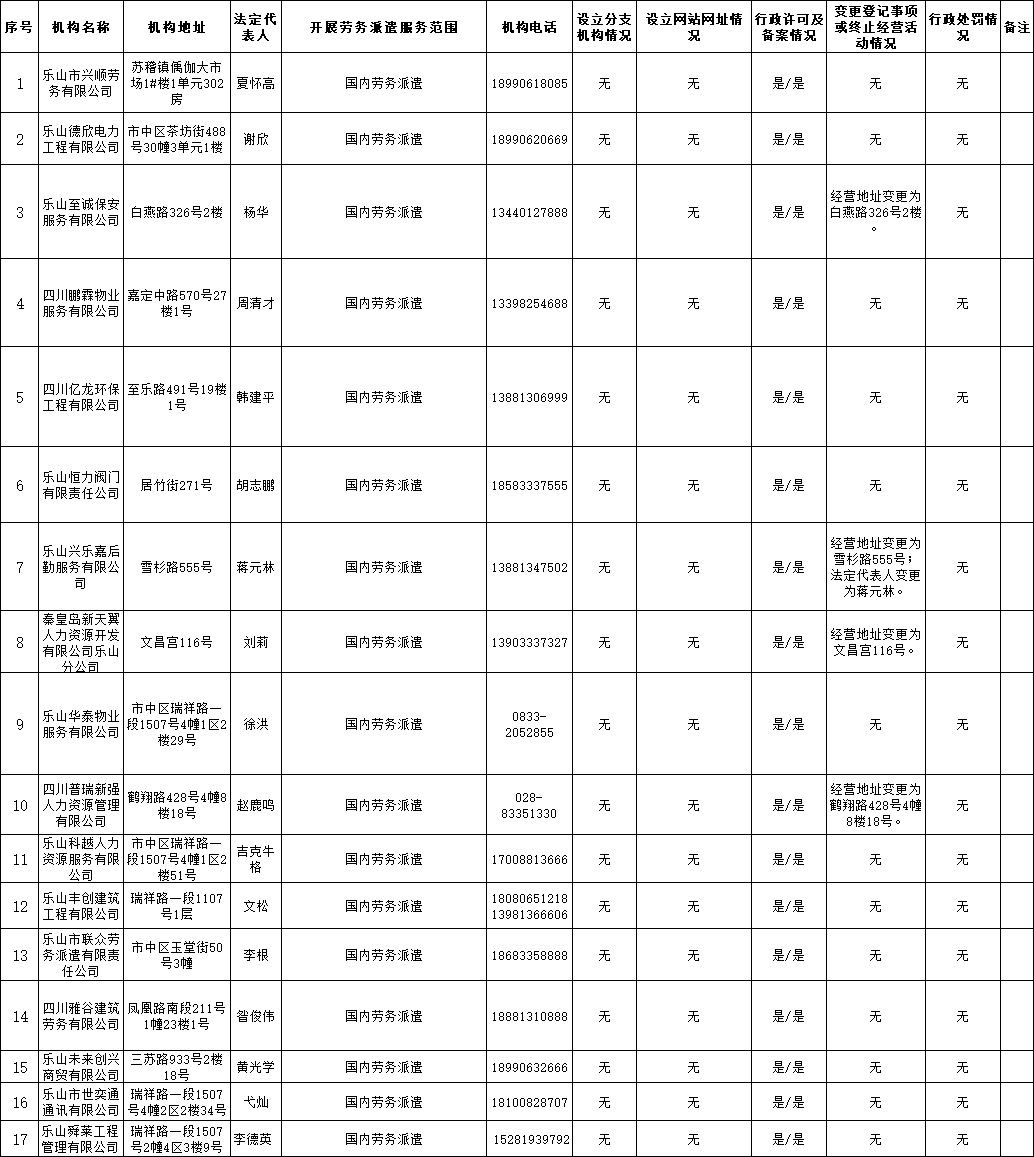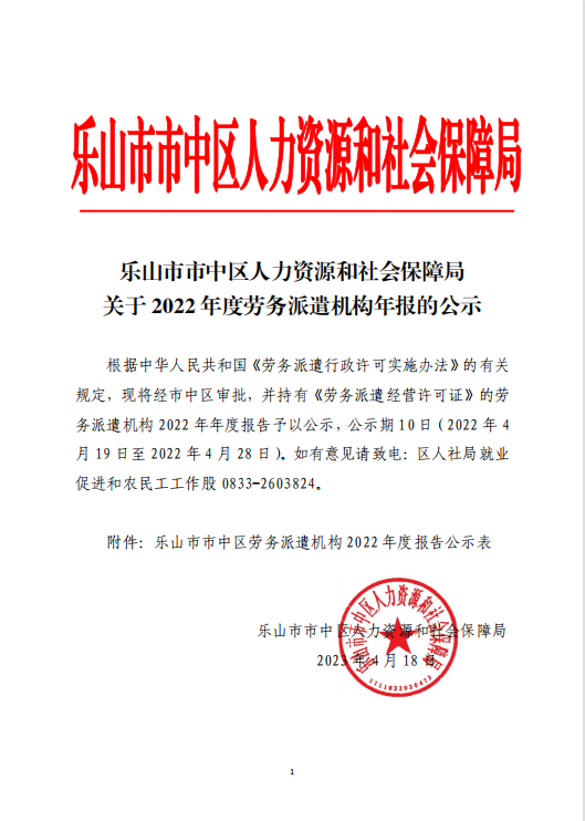 乐山市市中区人力资源和社会保障局 关于 2022 年度劳务派遣机构年报的公示