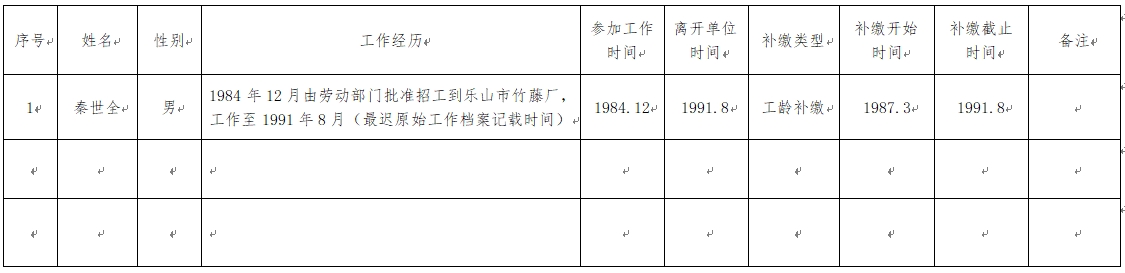 根据四川省人力资源社会保障厅《关于企业职工基本养老保险费缴纳有关问题的处理意见》(川人社办发〔2015〕158号)、省人力资源社会保障厅《关于下发<企业职工基本养老保险费缴纳有关问题的处理意见>补充意见的通知》(川人社办发〔2016〕62号)、四川省社会保险管理局《关于贯彻企业职工基本养老保险费缴纳有关问题处理意见的通知》(川社险办〔2015〕31号)的规定,经初步审核,拟办理秦世全企业职工补缴基本养老保险费补缴业务,现将有关情况予以公示,公示期为7天。如对公示内容存在异议,请在公示期内通过信函、电话等方式反映。反映情况要实事求是、客观公正,并提供联系方式,以便调查核实。