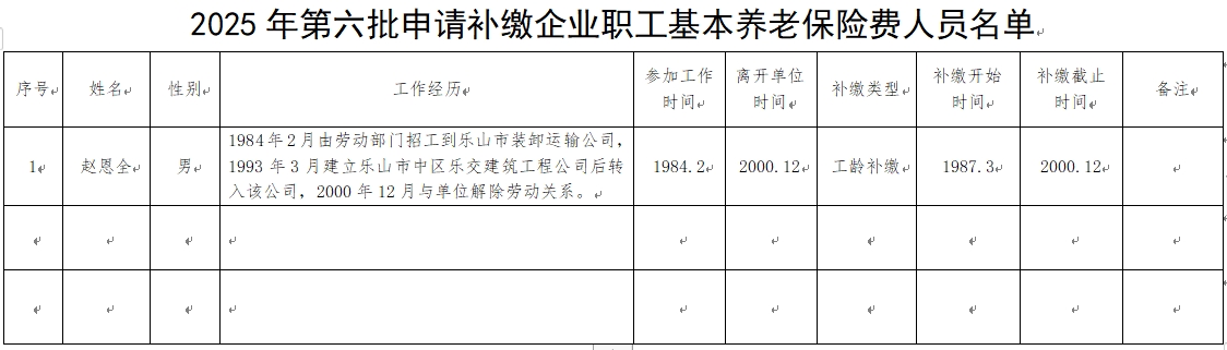 根据四川省人力资源社会保障厅《关于企业职工基本养老保险费缴纳有关问题的处理意见》(川人社办发〔2015〕158号)、省人力资源社会保障厅《关于下发<企业职工基本养老保险费缴纳有关问题的处理意见>补充意见的通知》(川人社办发〔2016〕62号)、四川省社会保险管理局《关于贯彻企业职工基本养老保险费缴纳有关问题处理意见的通知》(川社险办〔2015〕31号)的规定,经初步审核,拟办理赵恩全企业职工补缴基本养老保险费补缴业务,现将有关情况予以公示,公示期为7天。如对公示内容存在异议,请在公示期内通过信函、电话等方式反映。反映情况要实事求是、客观公正,并提供联系方式,以便调查核实。