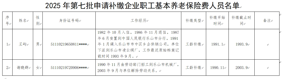 根据四川省人力资源社会保障厅《关于企业职工基本养老保险费缴纳有关问题的处理意见》(川人社办发〔2015〕158号)、省人力资源社会保障厅《关于下发<企业职工基本养老保险费缴纳有关问题的处理意见>补充意见的通知》(川人社办发〔2016〕62号)、四川省社会保险管理局《关于贯彻企业职工基本养老保险费缴纳有关问题处理意见的通知》(川社险办〔2015〕31号)的规定,经初步审核,拟办理王屿等2人企业职工补缴基本养老保险费补缴业务,现将有关情况予以公示,公示期为7天。如对公示内容存在异议,请在公示期内通过信函、电话等方式反映。反映情况要实事求是、客观公正,并提供联系方式,以便调查核实。