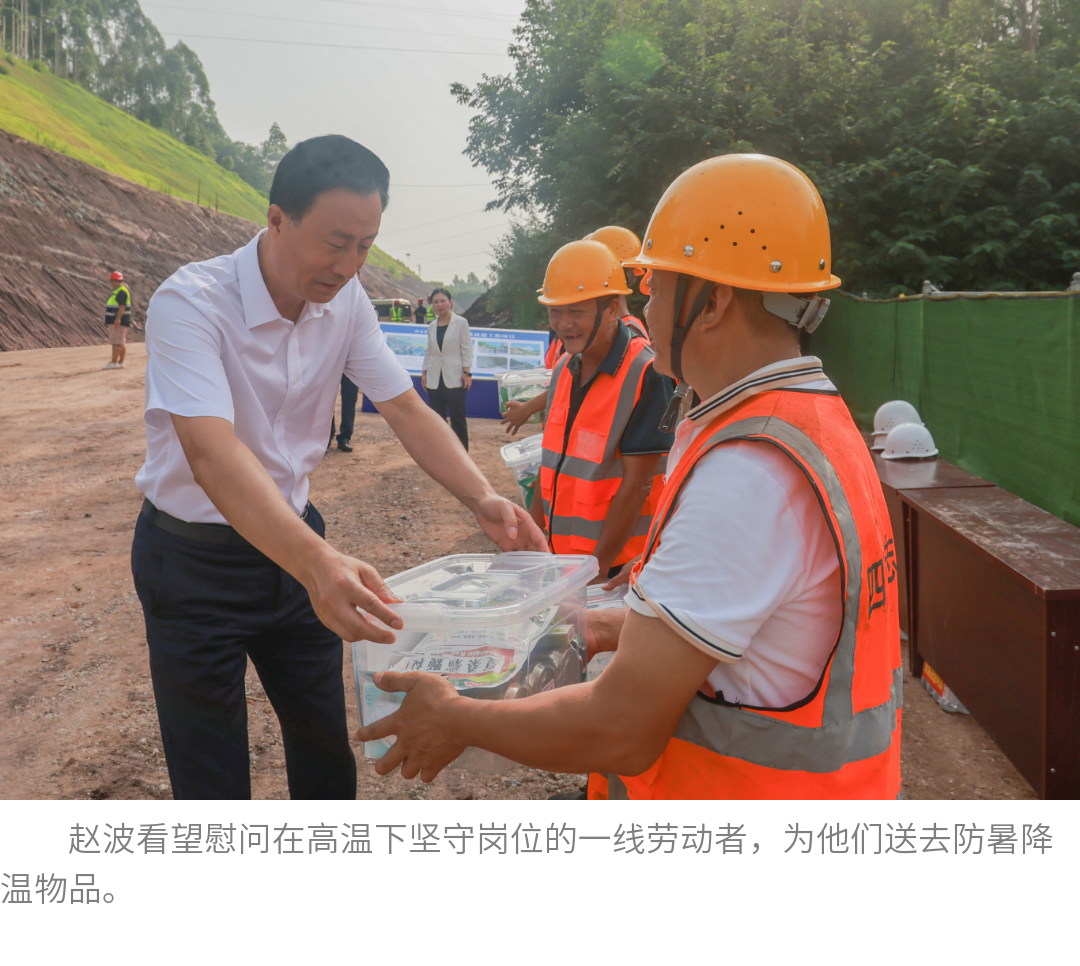 连日来,乐山持续晴热高温,气象部门接连发布高温橙色预警。调研中,赵波看望慰问了在高温下坚守岗位的一线劳动者,为他们送去防暑降温物品,叮嘱大家做好劳动保护,注意防暑降温,在确保安全生产的同时,继续发扬劳模精神、劳动精神、工匠精神,努力为乐山现代化建设作出更大贡献。他要求有关方面切实落实防暑降温主体责任,配齐配足防暑降温物资,用心用情保障一线劳动者健康权益,让他们安心工作、舒心生活。