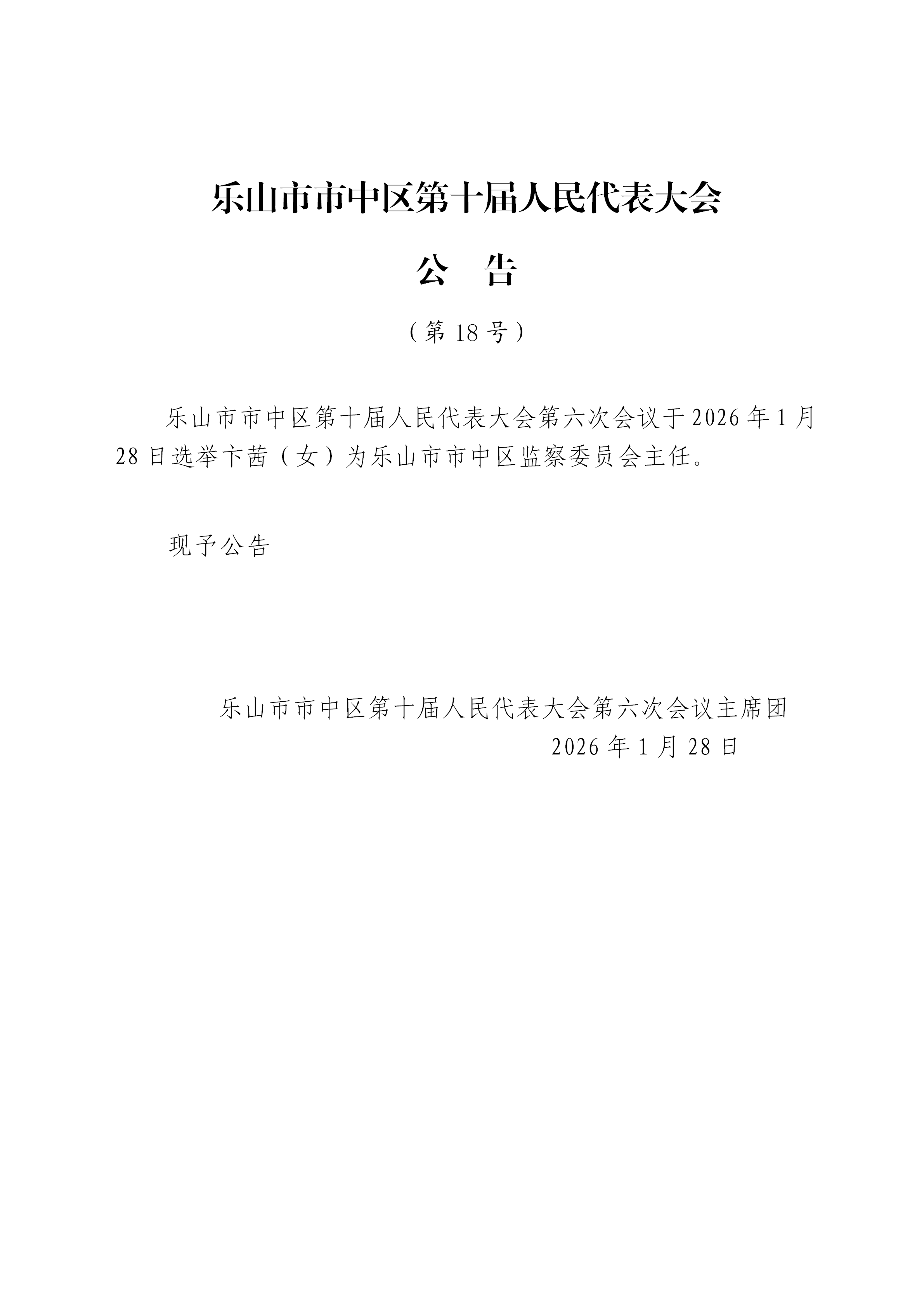 乐山市市中区第十届人民代表大会公告(第18号)