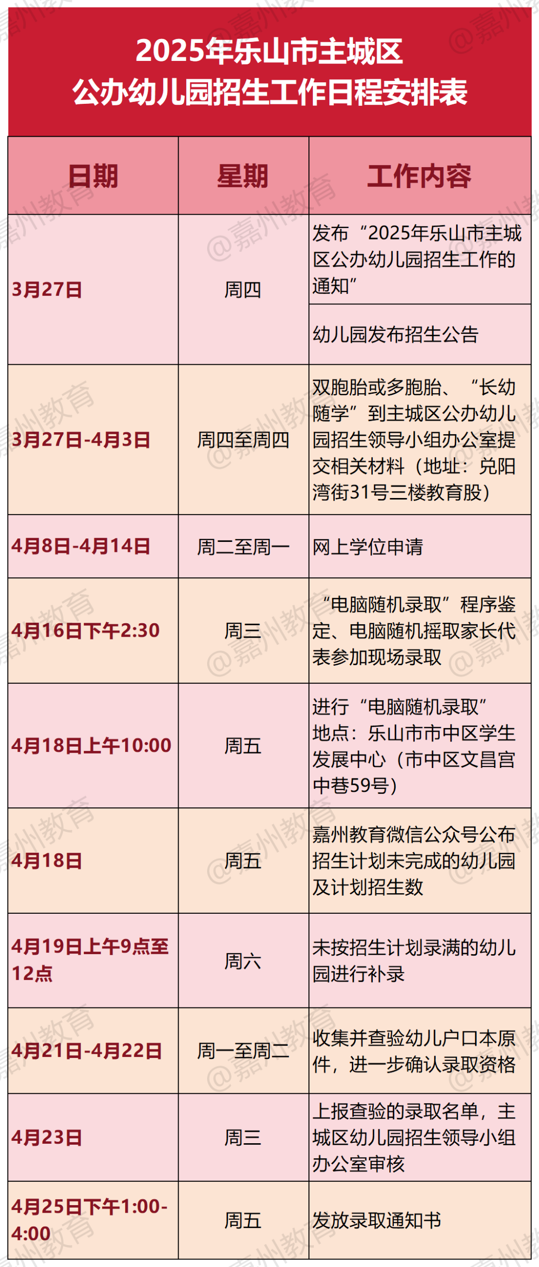 “乐山教育”“嘉州教育”微信公众号和各幼儿园微信公众号推出学位申请入口链接。依据乐山市主城区各公办幼儿园学位申请实际状况确定录取方式。若幼儿园学位申请人数大于该园招生计划数,采用“电脑随机录取”方式,“电脑随机录取”时间为2025年4月18日;若学位申请人数未超出招生计划数,则全部录取。若还有空余学位的幼儿园,在“电脑随机录取”工作结束后,于2025年4月19日上午9点至12点自主录取符合条件的幼儿。