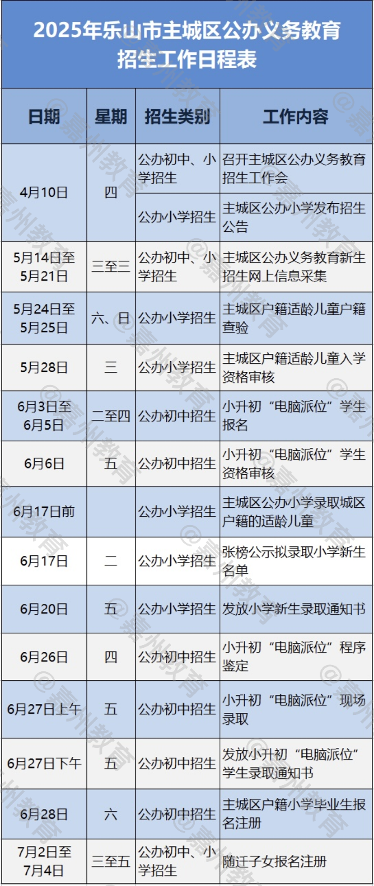 具有乐山市主城区户籍或具有乐山市主城区居住证的随迁子女,并有全国义务教育学籍的2025届小学毕业生。