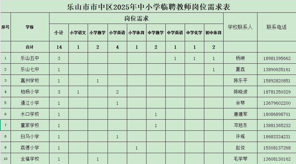 具体招聘学校、岗位及名额详见《乐山市市中区2025年中小学临聘教师岗位需求表》。