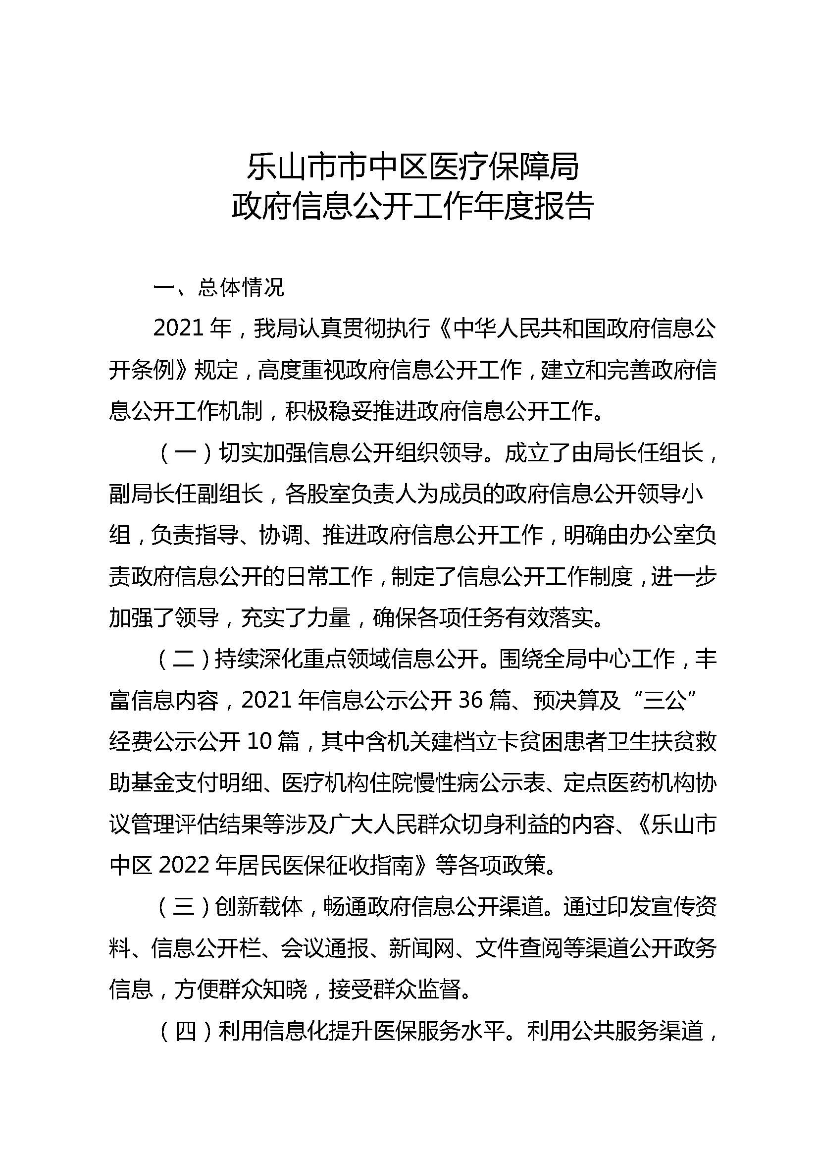 (二)持续深化重点领域信息公开。围绕全局中心工作,丰富信息内容,2021年信息公示公开36篇、预决算及“三公”经费公示公开10篇,其中含机关建档立卡贫困患者卫生扶贫救助基金支付明细、医疗机构住院慢性病公示表、定点医药机构协议管理评估结果等涉及广大人民群众切身利益的内容、《乐山市中区2022年居民医保征收指南》等各项政策。
