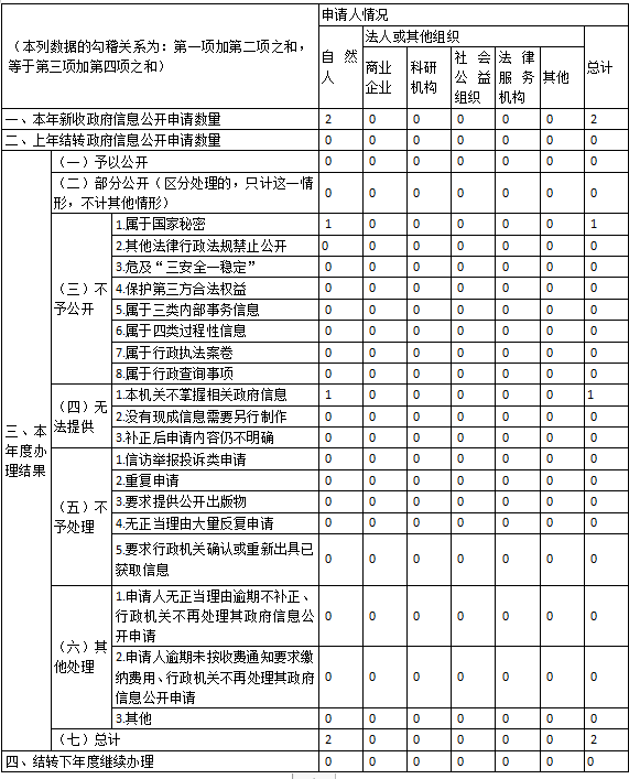 2021年,我局新收政府信息公开申请2条,1条属于国家秘密不予公开,1条属于本机关不掌握相关政府信息无法提供。