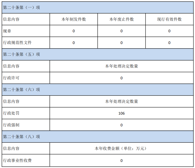 (一)主动公开。对照《乐山市市中区人民政府办公室关于2022年度政府门户网站信息内容保障计划的通知》(便笺〔2022〕-1)文件要求,我局积极依法公开政府信息。2022年,我局主动公开各类政府信息共101条,其中文件解读信息1条,工作动态信息4条,公示公告信息68条,执法监督信息1条,其他重点、热点政府信息27条。本年度公开的政府信息未发现影响或者可能影响社会稳定、扰乱社会管理秩序的虚假或不完整信息。
