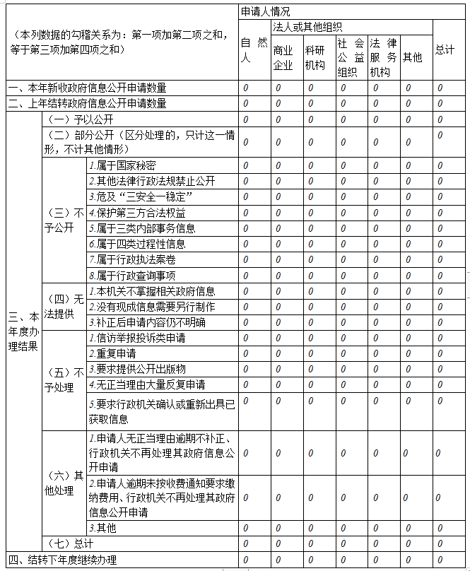 (二)依申请公开。对照相关文件要求,建立起规范的依申请公开办理流程,严格做好依申请公开接收、登记、办理、调查、答复等各个环节工作,依法依规答复。我局2022年未收到政府信息公开申请,未因政府信息公开被行政复议和行政诉讼。
