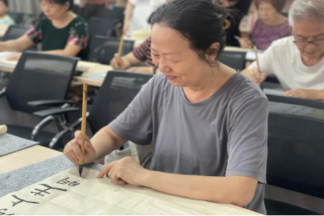 在书法课程上,老人们凝神静气,专注书写,从生疏到熟练,逐渐掌握书法书写技巧。