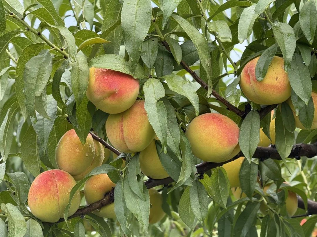 来到光明村冬琴家庭农场的黄桃园里,饱满的果实沉甸甸地压弯了桃枝,一场夏雨过后,黄桃园更显清爽,叶片上滚动的水珠顺着边缘滴落,打在黄桃饱满的果面上,折射出晶莹的光。被雨水洗过的黄桃色泽愈发鲜亮,果实与水珠一同摇曳,透着新鲜的灵动感。冬琴家庭农场负责人杨文学告诉记者:“今年黄桃产量不错,大约有一万多两万斤,目前主要通过村上给我们介绍买家,自己零售或者订单制销售,总的来说不愁卖。”