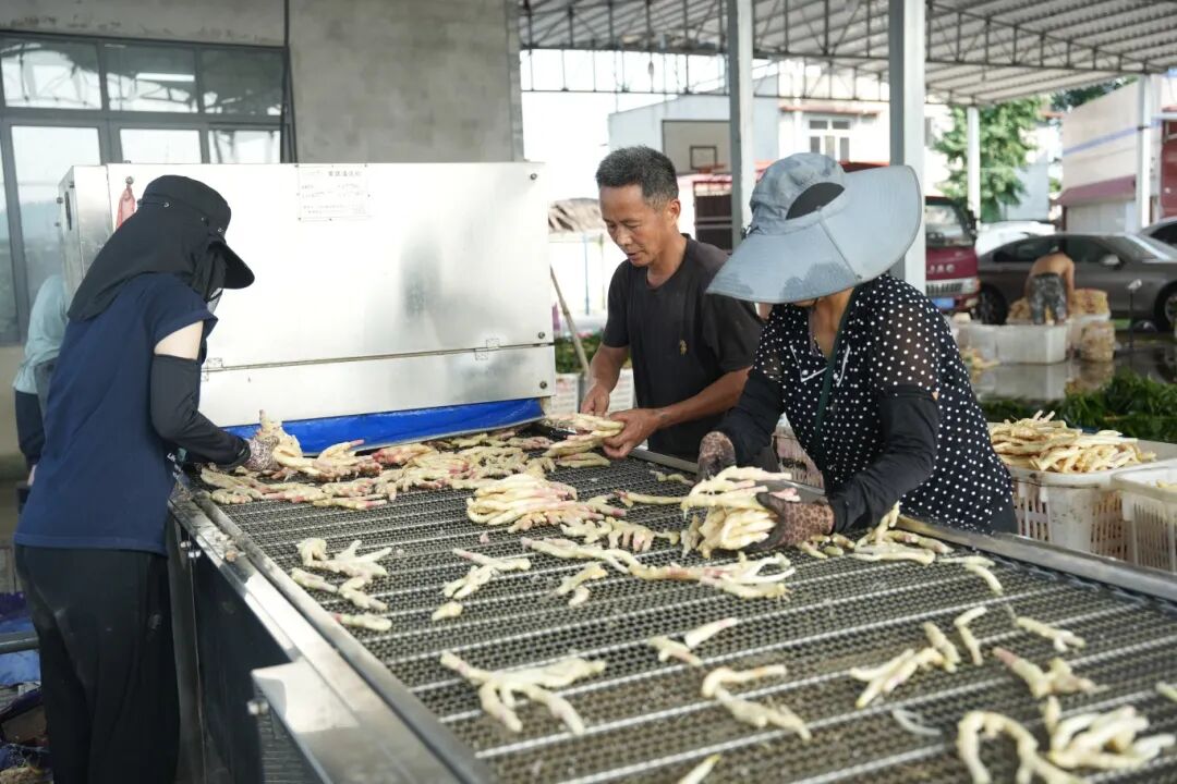 在老龙村的乐山市顺满茂果蔬菜种植专业合作社生姜清洗厂房,流水线的轰鸣声此起彼伏。不锈钢传送带上,刚从田里运来的生姜带着湿润的泥土,经过高压水枪的冲刷,瞬间褪去“尘衣”,露出金灿灿的表皮,姜农们在出姜口麻利地分拣,将大小均匀的生姜按规格分装,再称重、打包,整个流程衔接紧密。