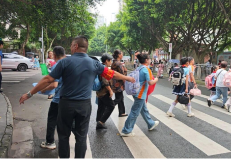 党员志愿者冲锋在前,联合社区工作人员、家校护卫队及综合执法大队,为学生们撑起新学期“安全伞”,以实际行动践行“党员在身边”的服务承诺。