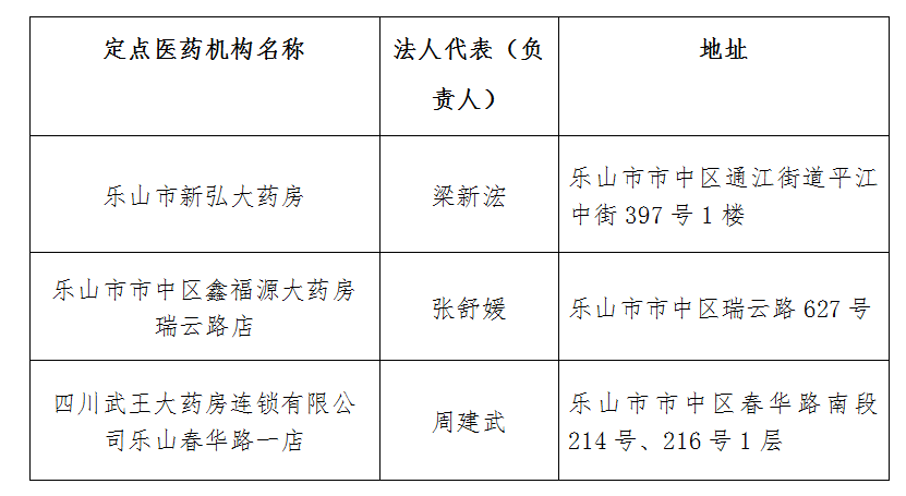 为加强和规范医药机构医疗保障定点管理,提高医疗保障基金使用效率,更好地保障广大参保人员权益,根据《医疗机构医疗保障定点管理暂行办法》(国家医疗保障局令第2号)和《零售药店医疗保障定点管理暂行办法》(国家医疗保障局令第3号)精神以及《四川省医药机构医疗保障定点评估细则》规定,经实地评估,报市中区定点医药机构协议管理领导小组审定,拟确定下列医药机构为乐山市市中区基本医疗保障定点医药机构: