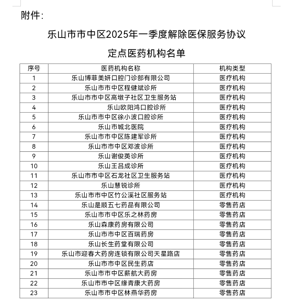 附件:乐山市市中区2025年一季度解除医保服务协议定点医药机构名单