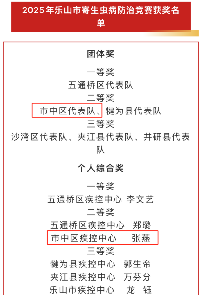 2025年7月,在由乐山市卫生健康委员会与市总工会联合主办、市疾控中心承办的“2025年乐山市地方病和寄生虫病防治技能竞赛”中,来自全市11个区(市、县)疾控中心及医疗机构的47名专业技术人员同台竞技。市中区代表队斩获寄生虫病防治竞赛团队奖1项和个人综合奖1项,充分展现了我区寄生虫病防治队伍扎实的专业技能与良好的团队协作精神。